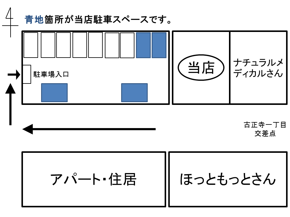 長岡インターチェンジから約3km。 ※駐車場が4台分あります。店舗向かって左側の駐車場をご利用下さい。